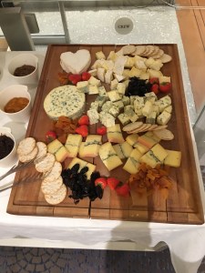 We are not coming back from this cruise skinny. Tried to stay lighter for lunch today with an open-faced shrimp sandwich, but then was tempted by the dessert of Warm sugar waffle with cherry compote. Sigh. There was an afternoon “tea” which featured coffee laced with Courvoisier under a thick cloud of whipped cream, plus tiny sandwiches, an assortment of pastries, and a tower of macarons. Dinner was an heirloom beet salad, 4-chop rack of lamb, Lyonnaise potatoes and dilled couscous, followed by a trio of profiteroles with chocolate drizzle.