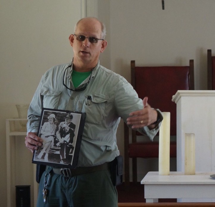 Jim inside the tiny AME church, with a picture of Tom and Elise Yawkey.