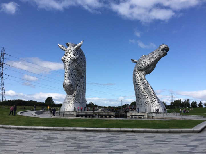 That said, 2 of the stops we made en route to the hotel were quite interesting. The first was Helix Park and the 90 foot tall aluminum (pronounced here as al-u-mini-um) horse head statues called The Kelpies. A kelpie is a Scottish shape-shifting water creature that can sometimes appear as a horse, but in this case the statues are also an homage to the huge draught horses once used to operate heavy lock mechanisms on the canals.