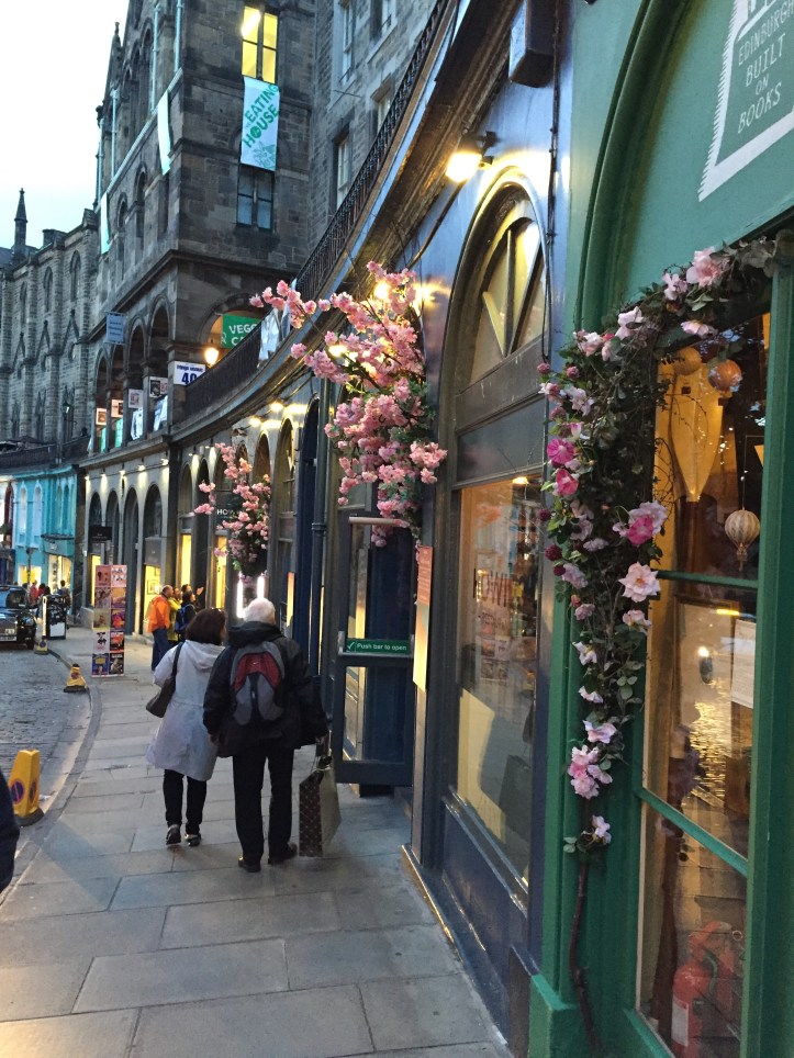 After our welcome dinner, a few folks from our group decided that half an hour of fresh air would help us get a really good night’s sleep. The streets are still full of people; in addition to the Tattoo, this is also the month for the Edinburgh Fringe Festival and the comedy festival, which means the city’s usual population of just over 530,000 has swollen to more than 1.5 million. Nonetheless, we did our best to avoid the crowds and took a quick stroll along winding Victoria Street which, with its alleyways, secret stairs, and tiny unique shops,was the model for Diagon Alley JKRowlings’ Harry Potter novels.