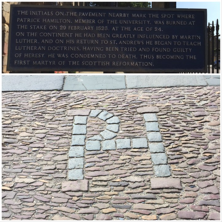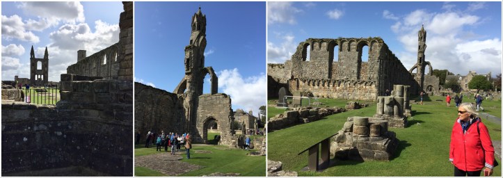 Neither Ted nor I are golfers, which is just as well since our tour, guided by local resident and St. Andrews University graduate Ken, focussed more on the religious history of the town. We walked in a strong North Sea wind from the Ancient golf course into town to the ruins of St. Andrews Cathedral, which once held a few bones from St. Andrew, who was martyred by crucifixion on an X-shaped cross (hence the X on Scotland’s flag). While we toured the ruins, a piper on the street above us was playing “Highland Cathedral”! We’ve seen churches older than St. Andrews in great condition in other cities. This church is in ruins not because of a disaster, but because it was so shoddily built – for show instead of durability, while the Cardinals and Bishops built their own grand palaces with church funds. Once the relics were taken from the church, attendance – and donations – quickly stopped and there was no money to make the constantly needed repairs, so the building crumbled. Stones from the ruins, many marked with a symbol indicating they had been consecrated, later turned up in buildings all over town. Ken called St. Andrews Cathedral the world’s first building supply store !!