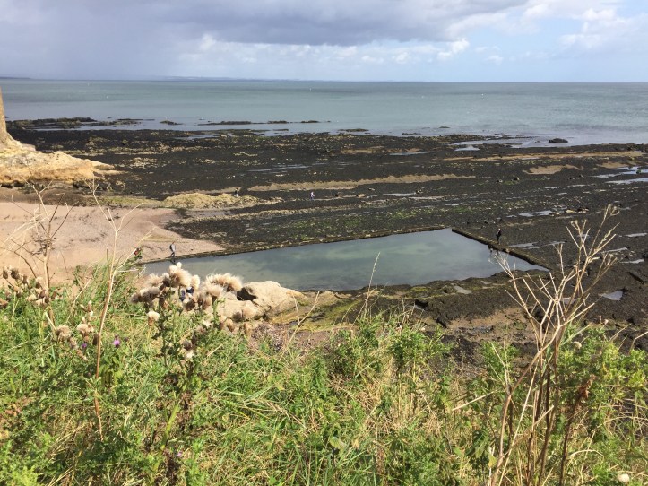 Below the castle, on the strand, is a large rectangular excavation reaching into the North Sea, with a dark rock bottom: an early public “swimming pool” that has its water refreshed twice daily by the tides, and is warmed by the sun hitting the dark rock.