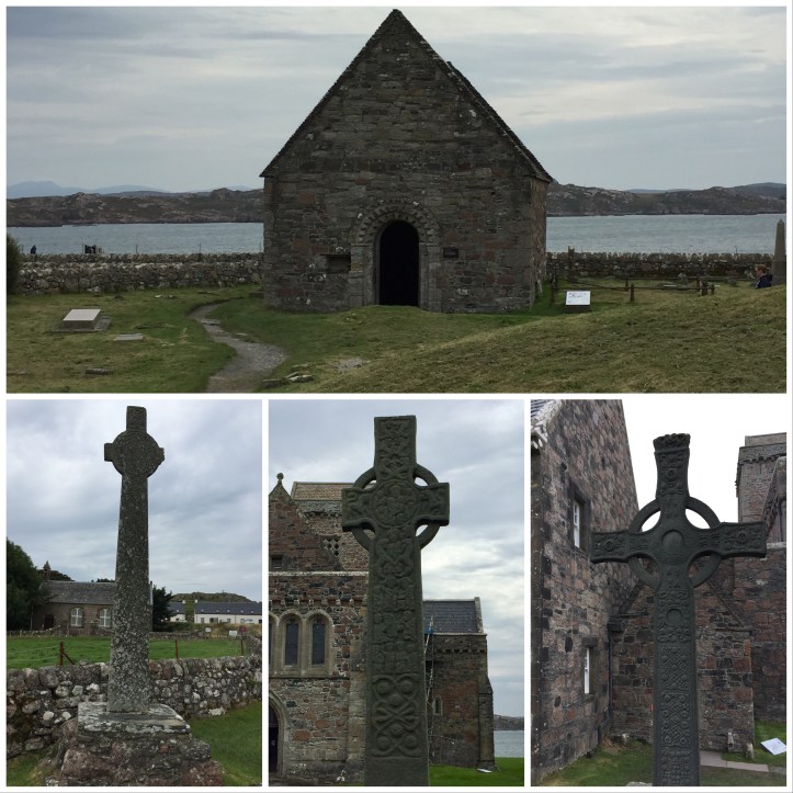 Top: St. Oran’s chapel, dating to about 1200. Bottom L to R: MacLeans Cross (aro AD1500); St Martin’s Cross (aro AD 780); St. John’s Cross replica (original is in the Iona museum)