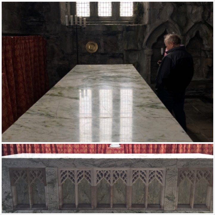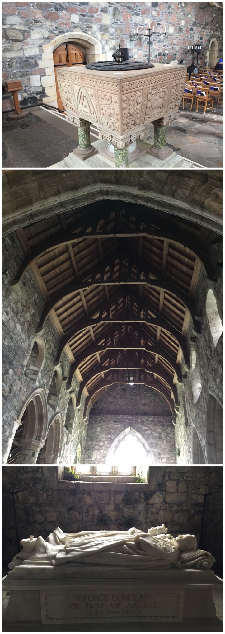 Top to bottom: the abbey’s font of red granite from Mull, with serpentine-veined Iona marble in the pedestals; the sanctuary roof interior supports; the marble tomb of of the Duke and Duchess of Argyll