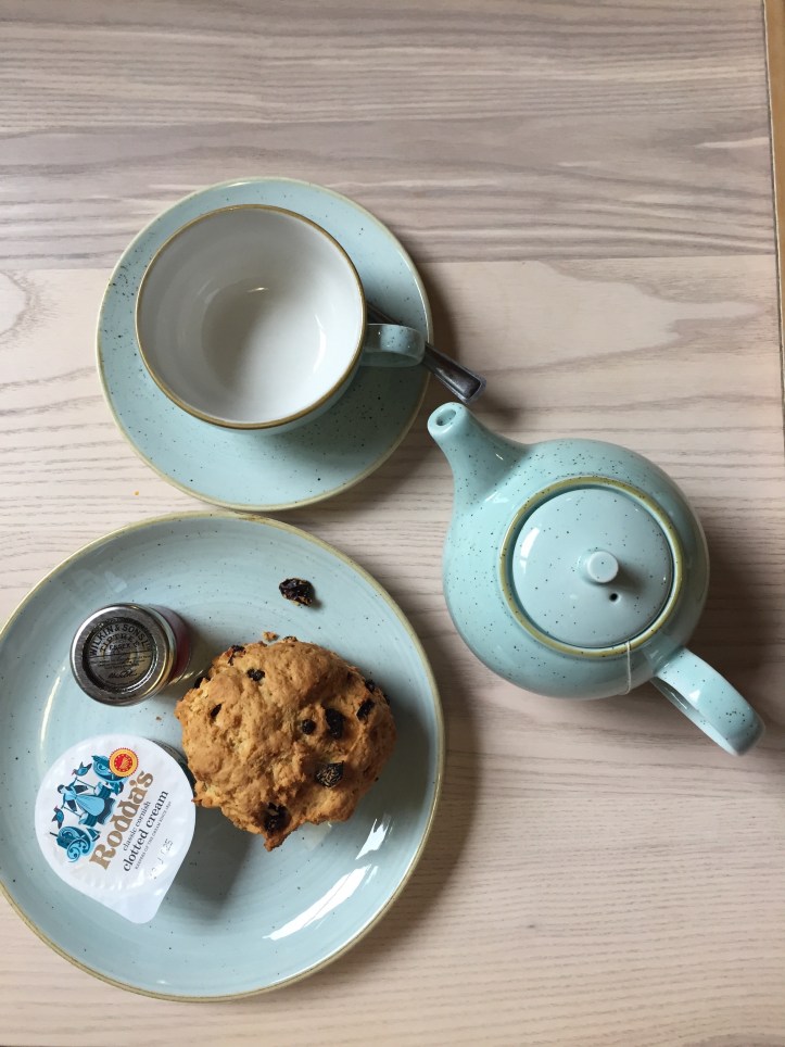 A Typical Scottish scone served with jam, clotted cream, and a pot of tea. This one is from the Inverewe Gardens Cafe