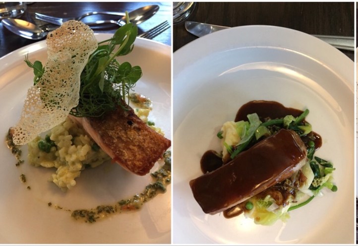 Pan-fried fillet of salmon with pea risotto, potato tuile and lemon garlic butter dressing; Cider-braised pork belly with creamy mashed potatoes, buttered greens and caramelized apple jus
