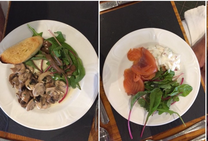 Dinner @ Isle of Mull Hotel and Spa. L to R: Hebridean mushrooms with garlic toast and blue cheese cream sauce; Ardmore smoked salmon with apple and celery salad