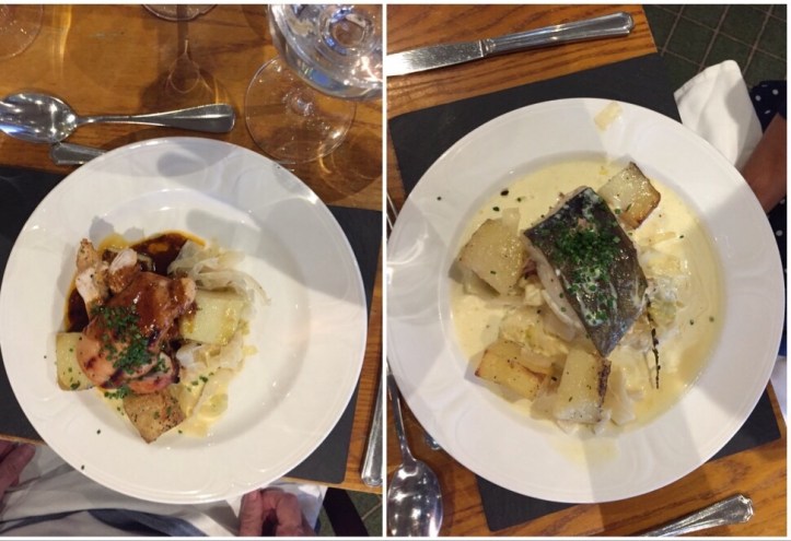 Argyll chicken supreme with Parmentier potatoes and braised cabbage; Cod filet with smoked Pancetta cream sauce, Parmentier potatoes and braised cabbage