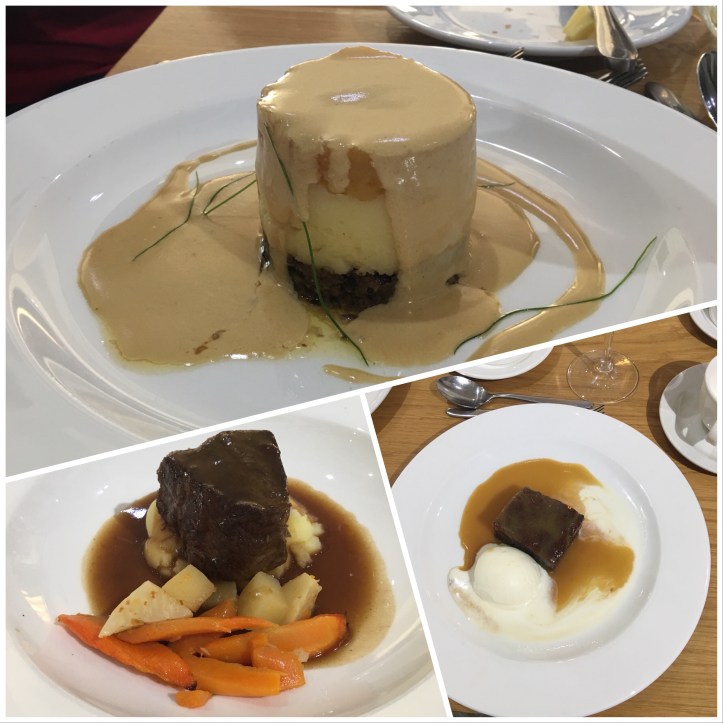 Dinner at the Black Bull / Kail-Yard Restaurant, Torbolton, South Ayrshire. Top: Haggis, neeps and tatties in whiskey cream sauce. Bottom L: Scottish beef rump roast over mashed potatoes, with braised carrots and turnips. Bottom R: classic sticky toffee pudding with vanilla ice cream
