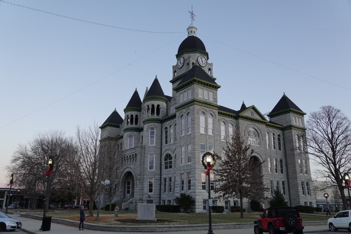 We reached Carthage, Missouri in twilight. Carthage was the site of the first major battle of the Civil War, commemorated on a small monument outside the stunning Jasper County Courthouse that is listed on the National Register of Historic Sites. The building is made of high quality limestone (aka “Carthage marble”) in a style called Richardsonian Romanesque. Apparently it is the second most photographed edifice in Missouri, after the Gateway Arch. Ted can now say he took pictures of both!