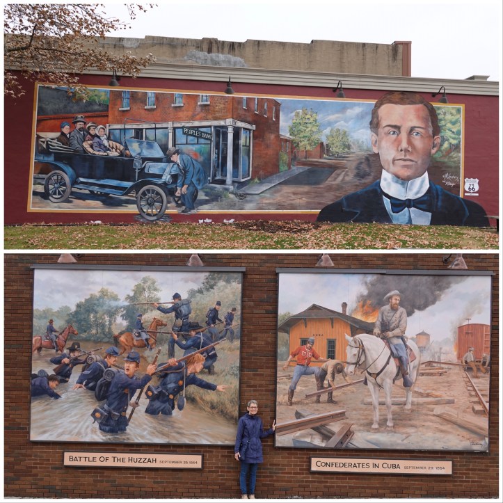 Our first stop was Cuba, Missouri. In an effort curiously parallel to one undertaken by the town of Chemainus on Vancouver Island, Cuba decided in the 1990’s to commission a series of huge murals around their small town of just over 3000 people, with a view to luring tourists off the interstate. The murals depict historic events from the civil war through to WWII, as well as 19th century business activities. In a second connection to Canada, two of the murals were painted by a Canadian muralist, Michelle Loughery.
