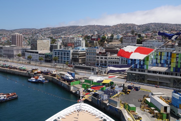 It turns out that almost 600 of us (the ship only holds 942) have arrived within minutes of each other, to be directed through security and baggage check and then onto about a dozen tour buses. As we drive the 90 minutes from the airport to the port itself, there are no signs of unrest along our route, just beautiful views of the Andes, the Casa Blanca vineyards, and walnut orchards.
