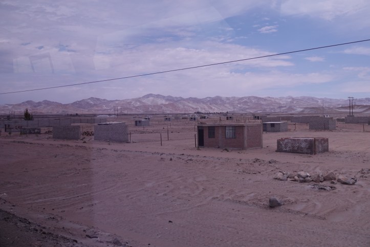 Some of the stranger things we saw along the way were uninhabited small grey cement block shanty houses placed seemingly randomly on the desert plateau areas. Around 40 years ago, people were encouraged to buy cheap plots of land outside the city ($20 !!) to relieve urban congestion. In order to effectively stake their claim, they needed to build a house on their land. Apparently “house” has a pretty loose definition; 4 walls that can stay standing. Some have roofs and doors, but many do not – they are just empty shells. Electricity was finally provided to these areas 2 years ago ( you can see the hydro wires below), but 40 years after these homesteads were sold, there is still no water supply. On the up side, there are no taxes assessed against them!
