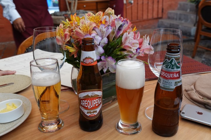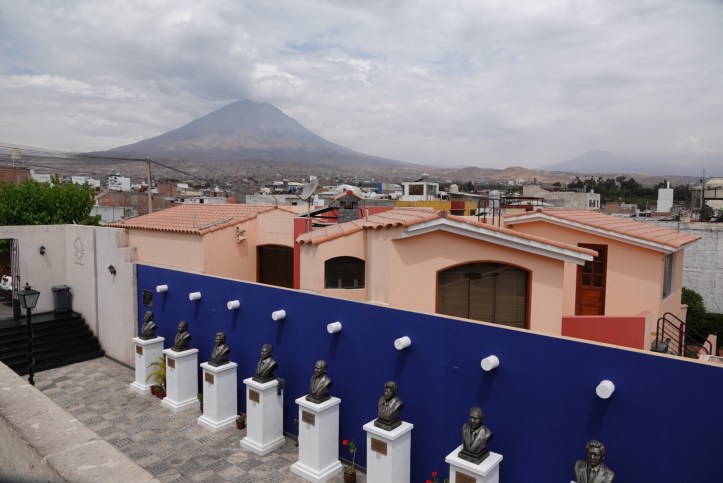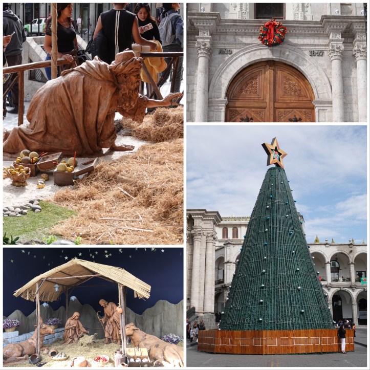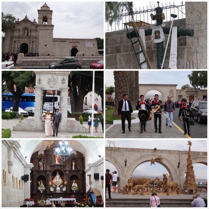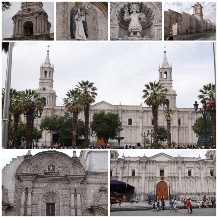 We finally reached Arequipa, where we had just over 2 hours to eat lunch and explore the city centre. The city was founded by the Spanish 1540 and is famous for its architecture as well as its blending of Spanish and indigenous cultures. We’d read that what gave the city its nickname “Ciudad Blanca” (white city) are the many Spanish Colonial buildings constructed from sillar, a pearl-white volcanic stone native to the Andes in this region. Our Peruvian guide had an alternative explanation: the Peruvians of the 1600’s began referring to it as the “white city” because it was inhabited mostly by privileged Spaniards, whose skin was whiter than theirs. Ted did his best to get a cross-section of the sites in photos.
