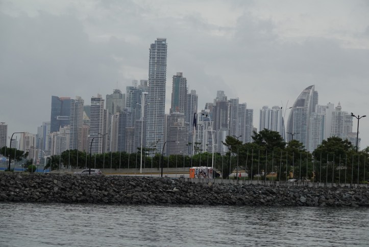 We did not visit the canal today, choosing instead to take a full day tour to the Casco Viejo (Old Town). Modern Panama City gleams with high-rises of every shape and colour, in heights up to 68 stories. It’s clear that architects have fun in Panama. The skyline is quite spectacular viewed in the sunshine. Unfortunately – or maybe fortunately given the UV index this close to the equator – today was mostly overcast, incredibly humid, and 28C/83F. We were forewarned about thunderstorms, so raincoats and a huge red Viking umbrella came ashore with us. December is, after all, the beginning of the rainy season.