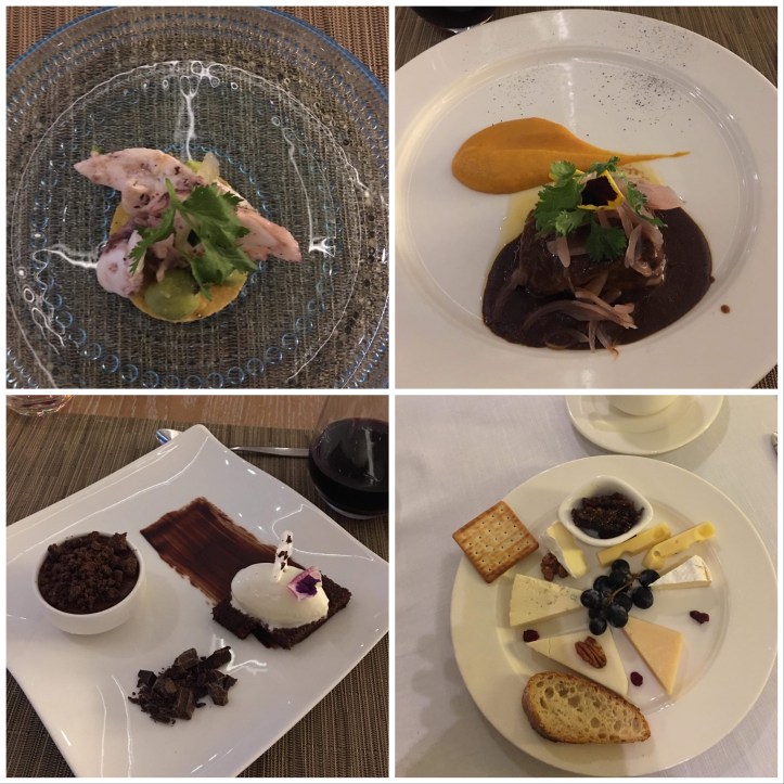 The ship’s pièce de resistance is The Chef’s Table, where every 3 or 4 nights a new 5-course curated menu with wine pairings is offered. We tried 3 different Mexican nights, one with guest chef Pia Quintana (Google her!) brought on board at Cabo who also did a cooking demo for us. We also enjoyed a Thai night and a British night. As we cruised, we overheard people unhappy with the rigidity of a fixed menu, unhappy about portions that were too small, or food that was too “nouveau”. Just goes to show you can’t please everyone. Ted and I thoroughly enjoyed getting to try foods we would not otherwise have experienced, and definitely enjoyed tasting 4 different wines with each meal!