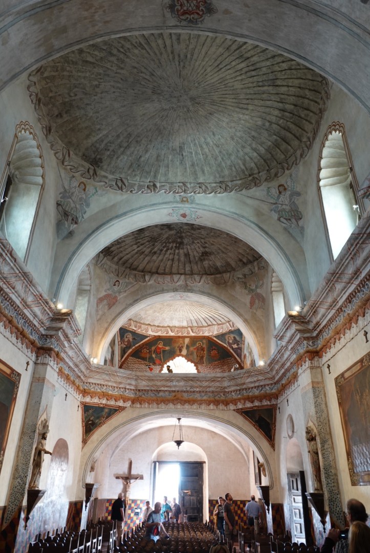 The main altar is decorated to look like the Franciscans’ image of heaven: God at the top centre, giving a blessing with his right hand and holding the earth with his left. Angels are at his side, with a shining gilded Mary a couple of levels lower. The figure in priestly vestments just above the altar and behind Jesus on the cross is Saint Xavier. saints Peter and Paul are in the two upper niches.