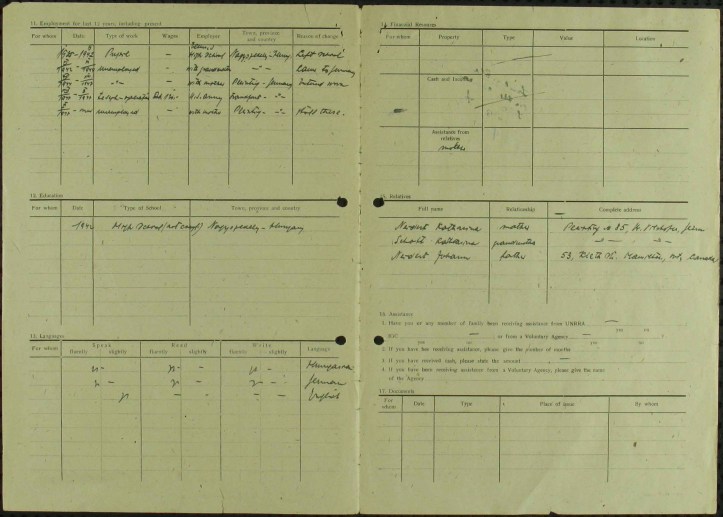 EDIT: Documentation for immigration help found after this blog entry was initially posted shows my mother working briefly in Frankfurt as a telephone operator, in between periods of unemployment when she lived with her mother and grandmother. It also “rates” her language skills: fluent in reading, writing and speaking German and Hungarian, and speaking English “slightly”. The address shown as her residence could be Pleinting 85 (a displaced persons’ camp in Vilshofen) or perhaps an abbreviation of Hauptstrasse 85 (Main Street) in the actual town of Pleinting.