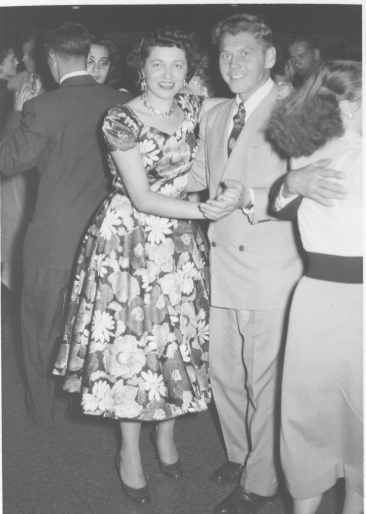 The legend says that on Saturday, February 27, 1954, mom’s 27th birthday, she and a girlfriend went dancing at the Schwaben Club. Mom wore a vibrant flower-printed satin dress that she had made herself. At the dance, she was introduced to a handsome young man in a tan double-breasted suit, who danced like a dream.