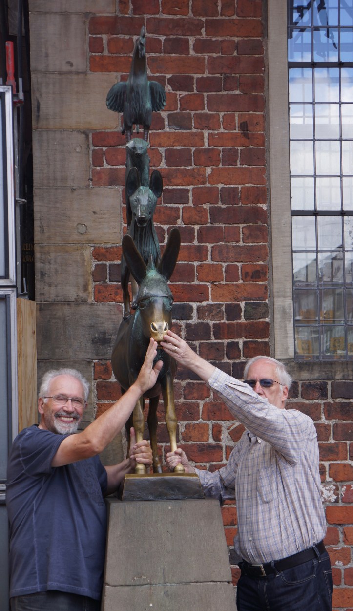 A couple of days later we took the nearby commuter train to Bremen, folkloric location of the famous Grimm tale “The Bremen Town Musicians” (Die Bremer Stadtmusikanten), and historic seat of commerce for the Hanseatic guilds and maritime trade. It is completely separate from Bremerhaven – the port city, “Bremen’s Harbour” – on the north sea, although connected to it by the Weser River. Officially, Bremerhaven is “the city at the seaport of The Free Hanseatic City of Bremen”, which is a mouthful in either language. We didn’t visit the port, although I hope to do so next year with son #2, so he can see the place from which his forebears sailed to Canada.