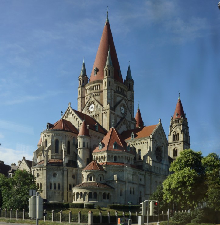 St. Francis of Assisi Basilica. Vienna’s iconic church is St. Stephen’s Cathedral with its ornate twin spires soaring over a mosaic patterned roof, but the very first beautiful church that WE saw after getting off our Danube river boat was St. Francis, the 7 centuries newer (1898-1910) church built to celebrate the 50th anniversary of the reign of Emperor Franz Josef I of Austria.