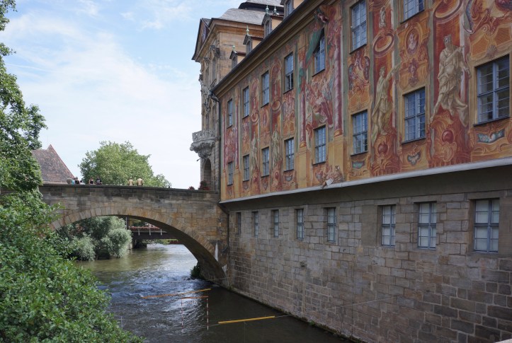 The Altes Rathaus (old city hall) has some of the most beautifully painted exterior facades we’ve seen to date. The building is built on an island in the centre of town, in the Regnitz River, and accessed by stone bridges. The original building dated to the 1400’s, but this Baroque and Rococo iteration was built between 1744 and 1756. The mural was refreshed between 1959 and 1962, giving it its current vibrancy.