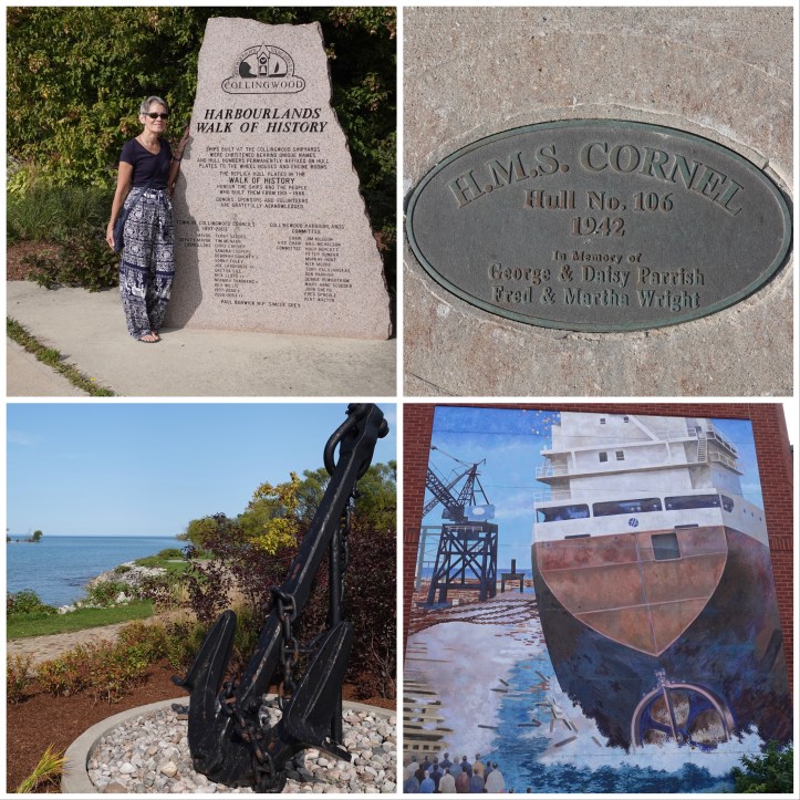 There’s lots to see on our walks. This town was once (1882-1986) a major shipbuilding centre where more than 180 lake freighters, coast guard ships and icebreakers, as well as 23 war ships (corvettes and minesweepers) were constructed and launched. It was also the northern terminus of the Grand Trunk Railway which brought passengers and freight to what was the jumping-off point by ship for lumber, grain, and farm goods heading to Canada’s prairies (traversing Lake Huron and Lake Superior to Thunder Bay). The downtown core is filled with monuments to its ship-building history, whether via the Walk of History displaying replicas of ships’ hull plates embedded in the sidewalk, ships’ artifacts, or huge murals.