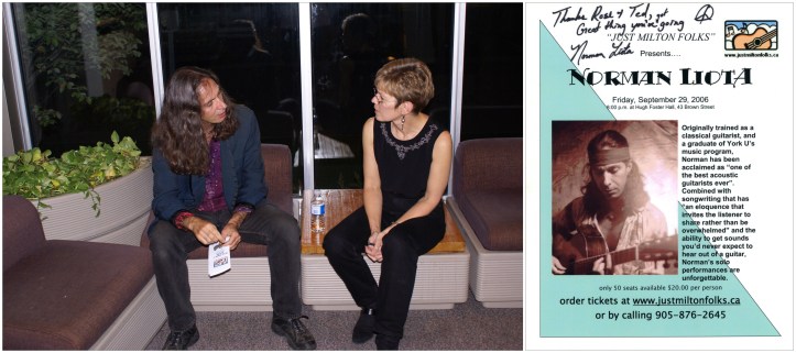 Norman stayed overnight with us, leading to one of Ted’s favourite Just Milton Folks memories: the “breakfast concert”. After muffins and coffee in our little kitchen, Norman asked if we would “mind” if he went through his morning warmup routine. Mind??? What followed were stunningly beautiful guitar renditions of Bach’s Jesu Joy Of Man’s Desiring, a few of Norman’s own instrumental compositions, and Mason Williams’ Classical Gas. He made that last tune look so effortless that Ted’s reaction was “I hate you!”