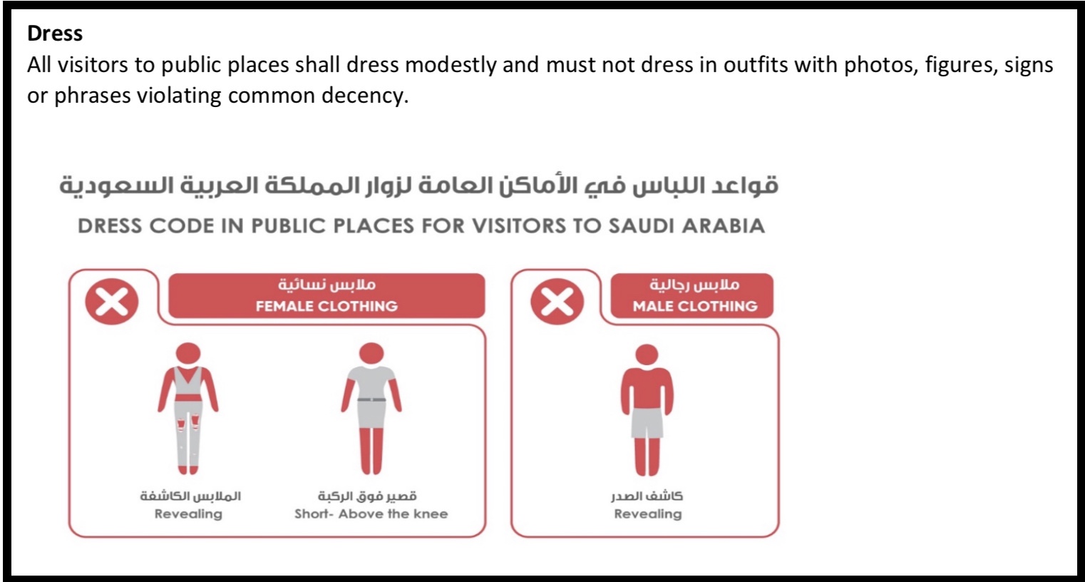 Our visa application for Saudi Arabia actually included a graphic specifying the types of dress that are NOT allowed: exposed shoulders, elbows and knees on women – bare arms, legs and torsos on men.