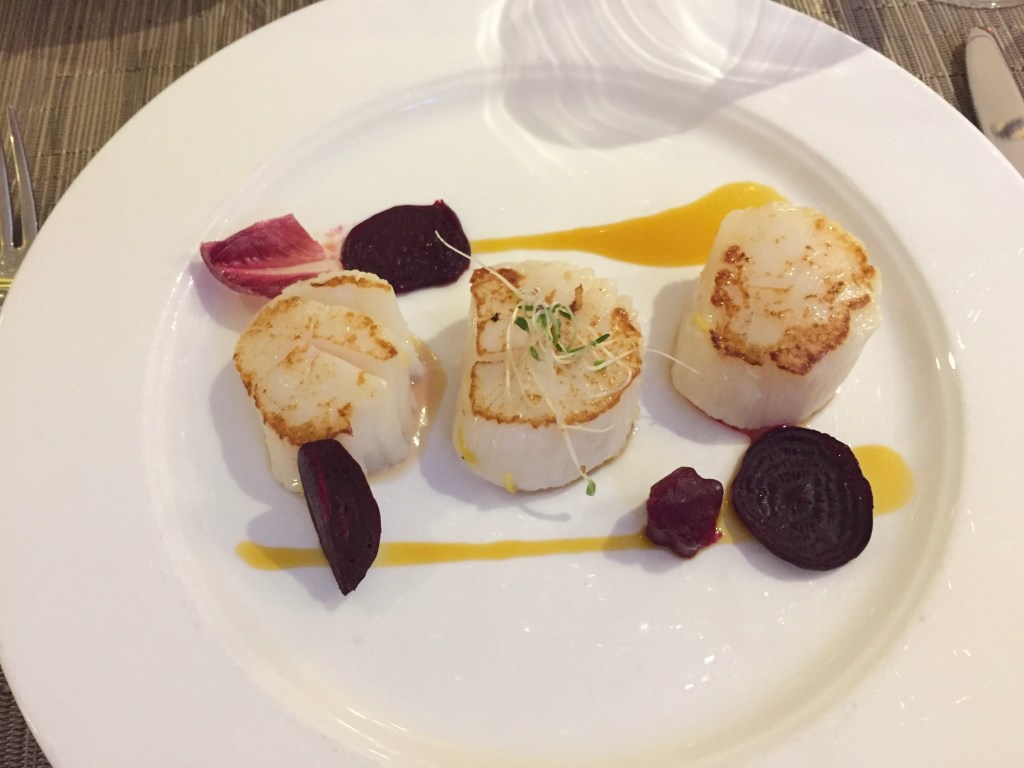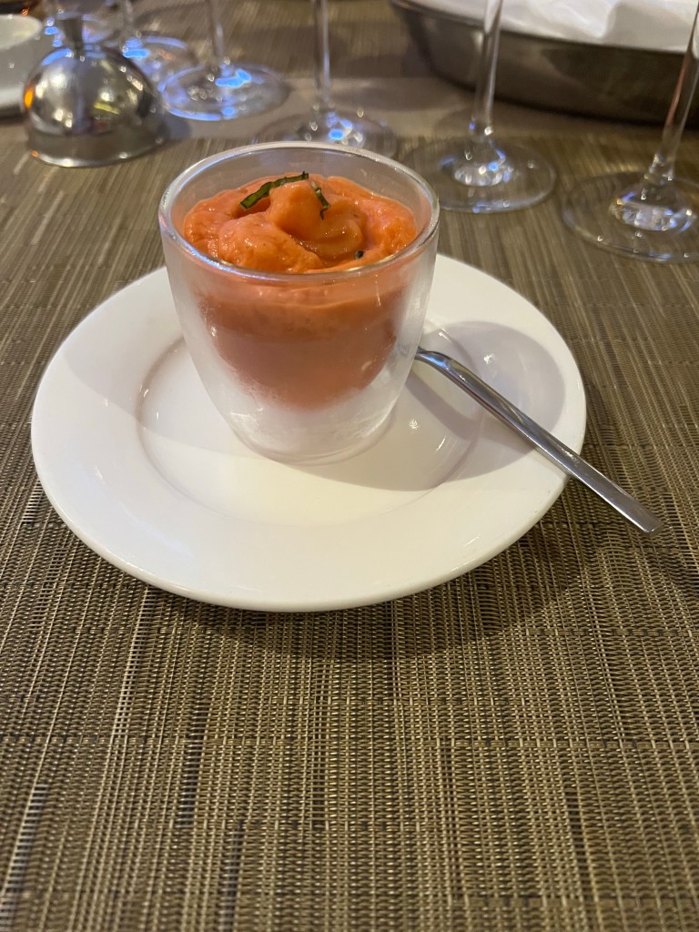 After returning to the ship, greeted by a brass band, and changing out of our more casual touring clothes, we headed for dinner, which was an absolute stunner. We were able to snag a table at The Chef’s Table for their new “Sweet and Salty” tasting menu – maybe our favourite to date. The concept of the menu was to highlight the first two of the 5 tastes that the human tongue registers: sweet, salty, bitter, sour, and umami.