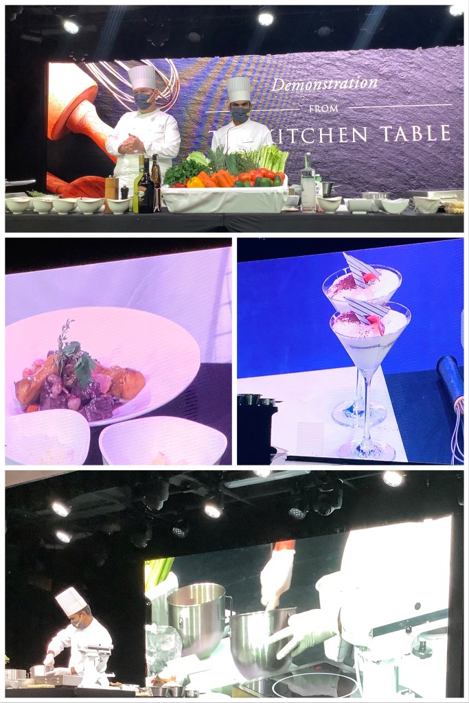 Top: the stage set-up. Centre L: the finished Boeuf à la Bourguignonne dish, ready to be enjoyed with rice, linguine or (my favourite) a crusty baguette. Centre R: Sous Chef Ernesto’s tiramisu – BEFORE Chef Pascal decided it needed to be topped “generously” with chocolate. Bottom: the large projection screen that allowed us to watch the chefs more closely.