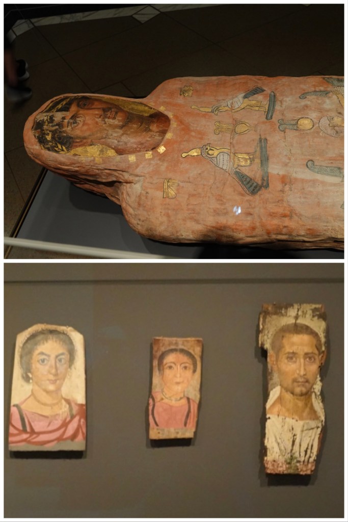 On the second floor, the Roman exhibit, in addition to all the kinds of things seen on the first floor, includes a mummy of Herakleides from Roman Egypt around 120-140 AD, along with a selection of mummy portraits, detailed depictions of the deceased person painted in tempera on wood, and incorporated into the mummy wrapping.