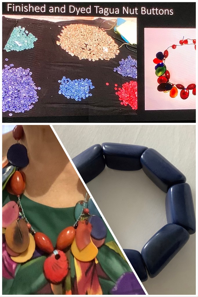 Dr. Bradley also touched briefly on tagua nut buttons and jewelry, a sustainable rainforest product. She was wearing a gorgeous dyed tagua nut necklace today, which reminded me to take a photo of the blue dyed tagua nut bracelet that I bought in Ecuador in 2019.