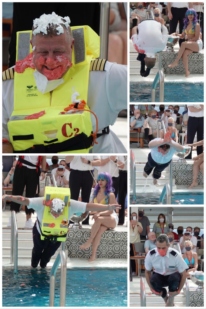 The guilty (naturally they were ALL guilty) Pollywogs were “marked” – sometimes quite enthusiastically – with meringue and forced to “cross the line” by jumping into the pool in full uniform and emerging on the other side.