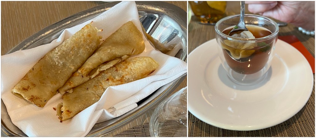 Before our meal, we were given a small platter of leffse, Norwegian potato pancakes that have the texture of a thick crepe, with the taste of potato. Yummy. Our amuse-bouche was a delicate veal and chicken consommé with a handmade ravioli stuffed with reindeer meat, paired with a Tassajara pinot noir from California’s Monterey Valley. We all agreed that the wine elevated the consommé into something really special.
