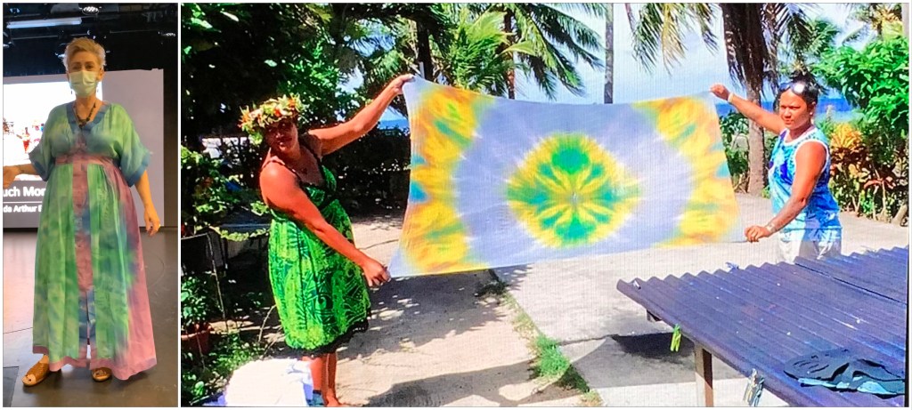 In Bora Bora, pareos are created by tie-dying using photo-reactive “sun dyes” which allow the colours to be subtly changed by overlaying design elements on the wet fabric before drying it in the sun. When the overlaid templates are removed, a pattern is created over the tie-dye.
