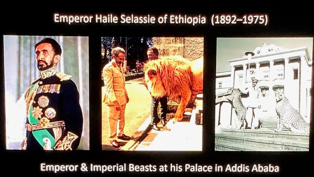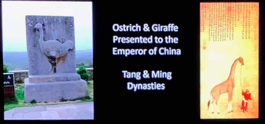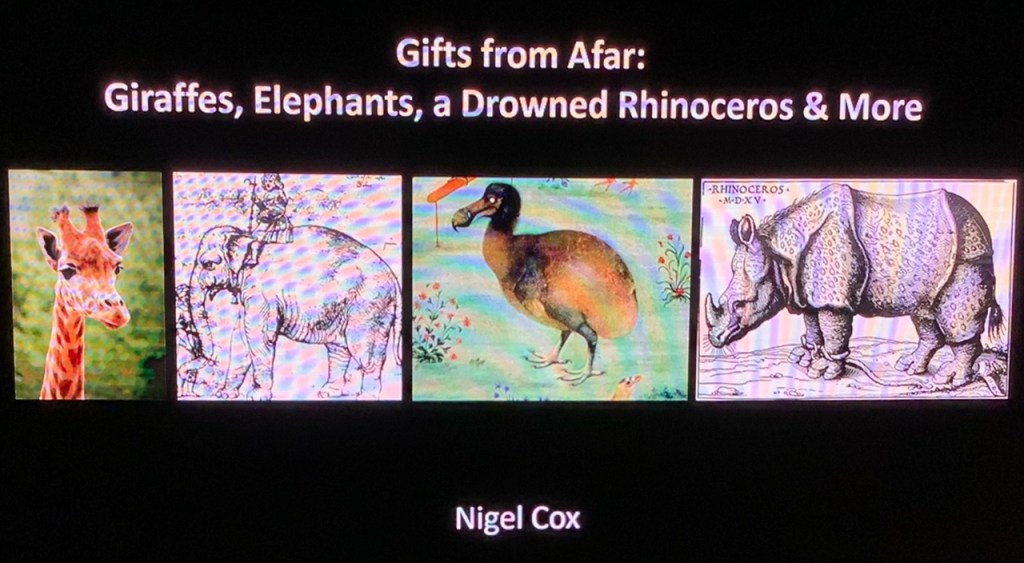 Nigel Cox’s talk on “Gifts from Afar: Giraffes, Elephants, a Drowned Rhinoceros & More” intrigued me, especially because when Ted and I visited Buckingham Palace in 2017 we saw an exhibit of gifts that had been given to Queen Elizabeth II over the years. Some were extremely valuable, some were beautiful, some were fascinatingly exotic, and some were just truly odd.