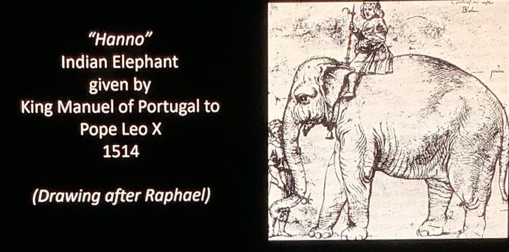 The Sultan of Bengal presented a giraffe (a “cameleopard” – think about it) to the Chinese emperor in 1414. The Sultan of Egypt presented another to Lorenzo de’Medici later, in 1487; the giraffe was allowed to roam the streets of Florence. Raffaelo Botticini subsequently included a giraffe in his painting Adoration of the Magi. Occasionally giraffes were depicted with pointed horns in place of the 2 ossicones on their head; in one case a giraffe was pictured as having a unicorn horn! Lorenzo de’Medici’s son Giovanni later became Pope Leo X – the pope who eventually received those exotic animals from King Manuel of Portugal.