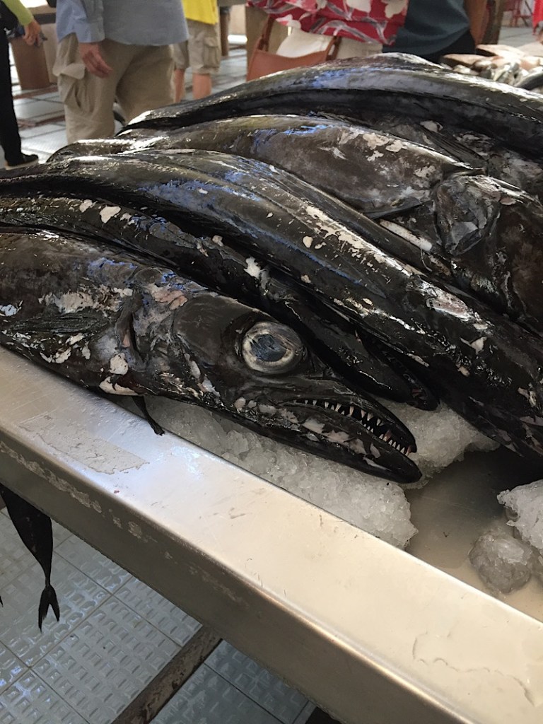 One of the most common fish here is the Espada, or black scabbard fish. Our tour guide suggested trying it before seeing it, since it is a particularly ugly fish. It lives at depths of 180 to 1700 metres. Madeiran fishermen do not have to go far from shore to catch it, since the island drops off steeply into the ocean.