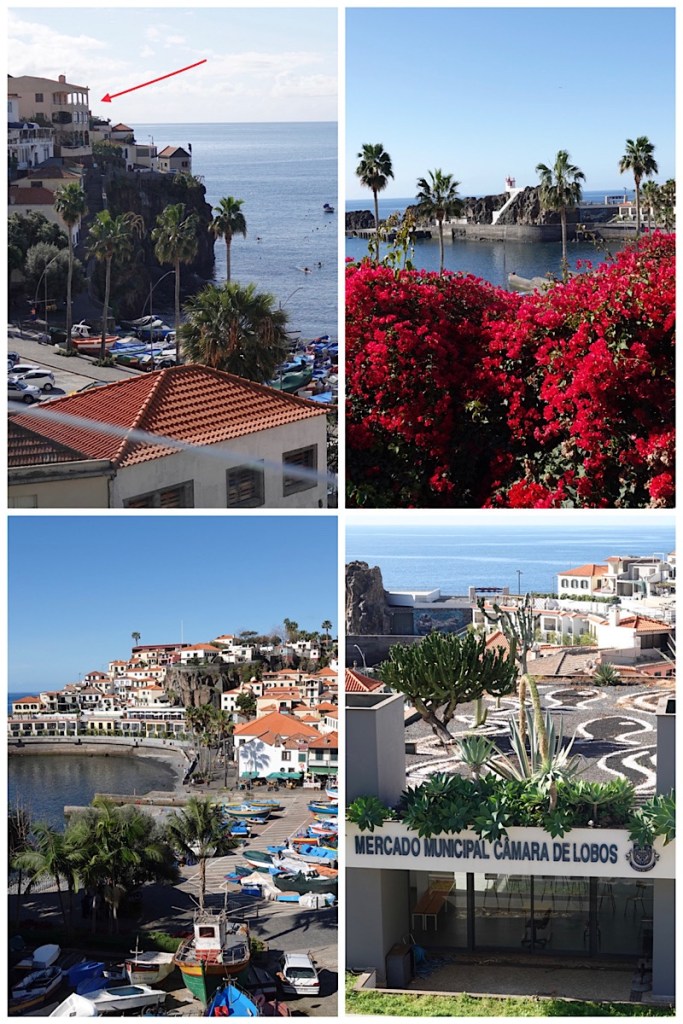 On the way back down, we drove into the fishing village of Câmara de Lobos (“Seawolves Lair”), which was a favourite holiday spot of Winston Churchill, who regularly painted pictures of the fishing boats on his vacations here. The hotel where he stayed (the arrow below) now bears his name, and houses a restaurant and grill as well.