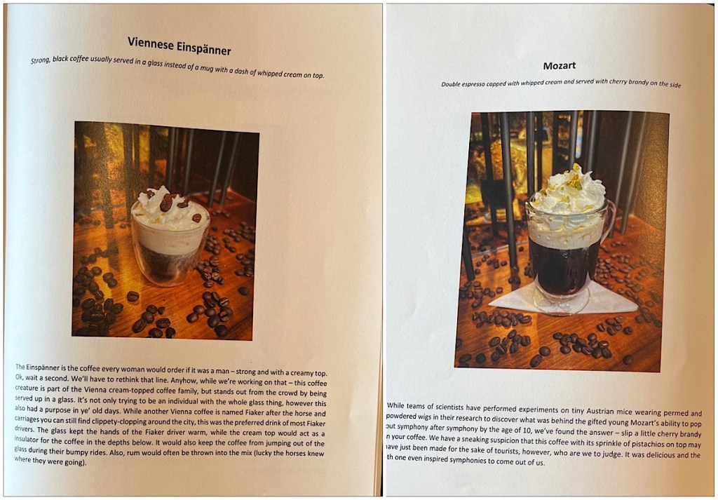 True to Viennese tradition, the coffees were varied and delicious. A couple of the clever descriptions (for the ones Ted tried) are shown below. Of course, Eiskaffee was also on offer. Unlike North American iced coffee, this “ice coffee” is made by adding a generous scoop of rich ice cream to a cup of strong hot coffee, and topping it with Schlag (whipped cream).
