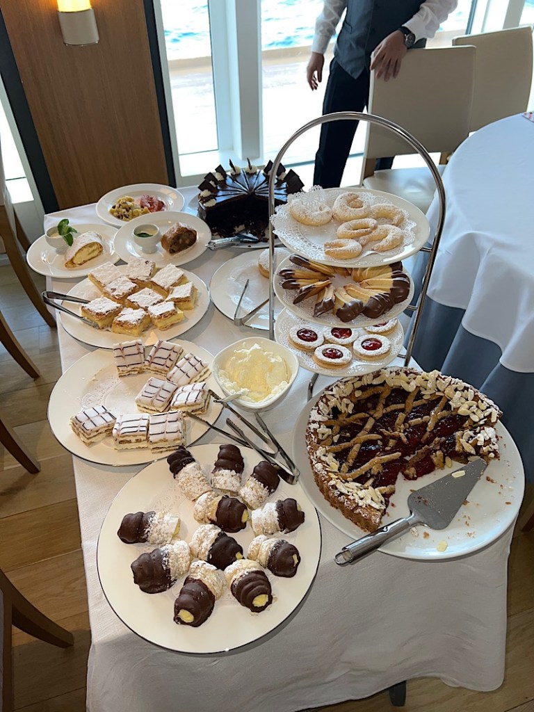 I saw nothing and no one except the bed and bathroom until almost noon (shall I pretend it was 11:00 a.m. old time?), despite the lure of an Austrian brunch. The sun was shining brightly, but the sea was rough and I felt worse this morning than I have at any time so far on our cruise. The captain shared later on that the sea swell today was about 12-14 feet (4 meters) on the port side, which is apparently better than if it were starboard, although I don’t know why. Nonetheless, even he acknowledged “rough” seas. I know this cruise diary has chronicled a few seasick days, but I’m still convinced that this is the best way to travel when wanting to visit multiple countries.