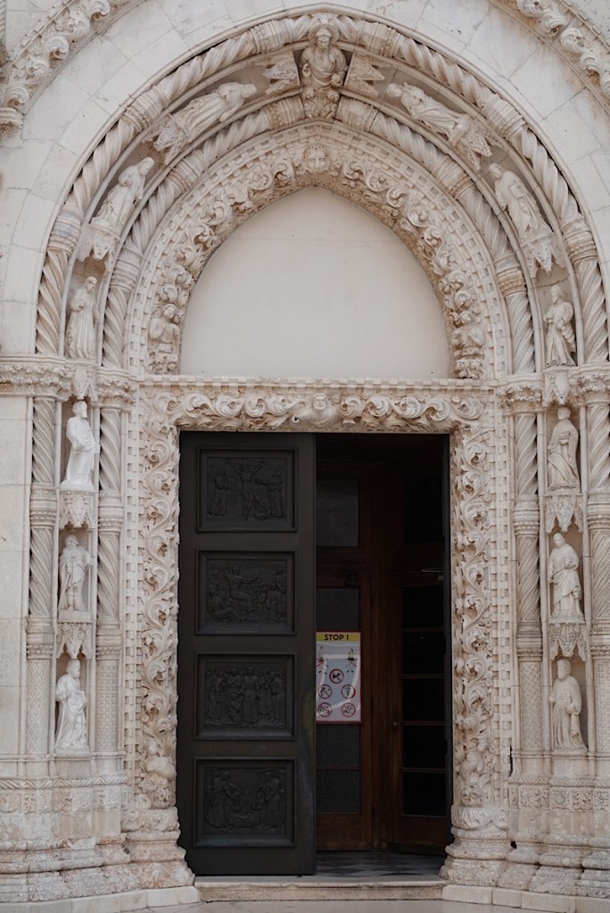 The main west façade of the cathedral looks quite traditionally Renaissance, with just a few Gothic touches like the spiral columns, and seems fairly rectangular. The arch around the door features the 12 apostles and Christ.