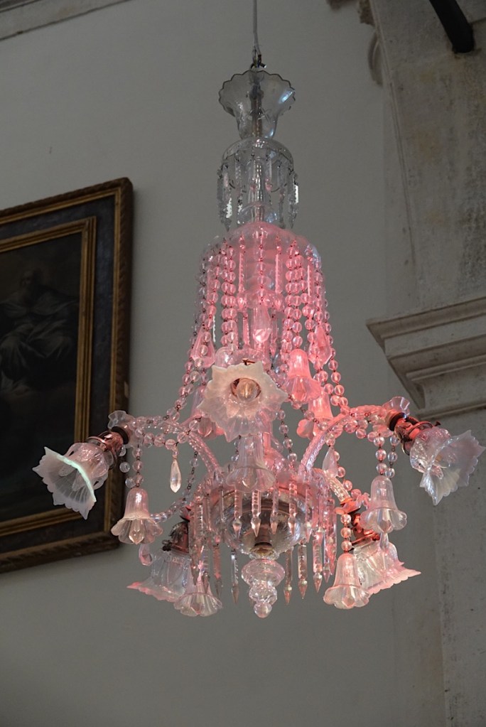 This Venetian glass chandelier is actually clear, but picks up colour from the sunlight shining through the stained glass windows.
