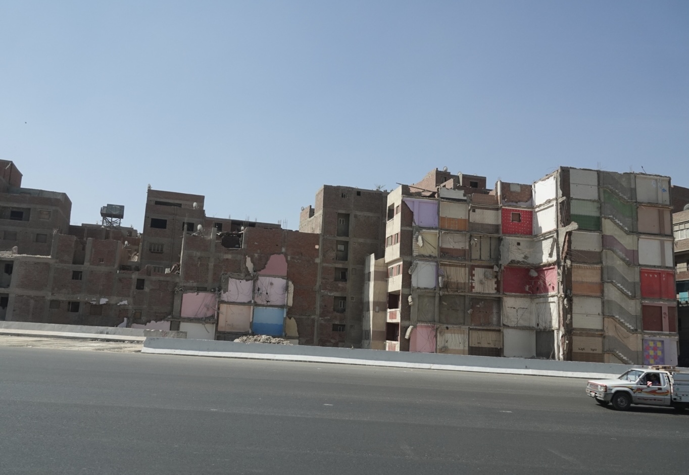 One of the interesting sights on our drive were dozens of apartment buildings that looked as though they’d been cut in half. We could see staircases and painted interior walls in some cases. Our guide explained that these buildings were built on government and farm land, without permits, around the time of the Arab uprising in 2011. When the highway recently needed expanding, these buildings were expropriated, but only the portion needed to accommodate the new highway lanes. Since the buildings are almost modular in design, “stacks” of apartments could simply be shaved off!