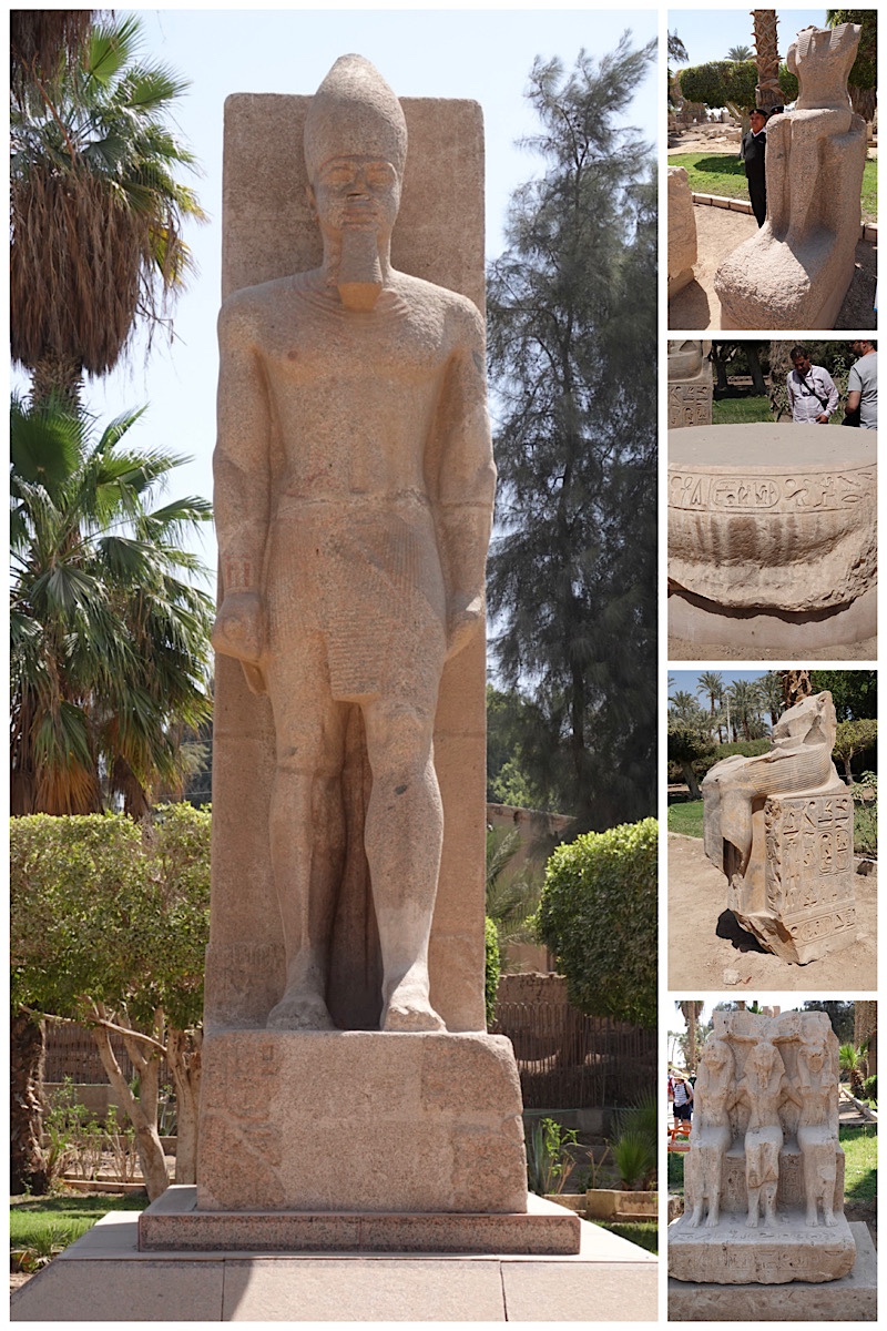 After driving through part of Cairo and along one of the Nile irrigation canals, we reached the ancient city of Memphis, the historic capital of Egypt for 8 consecutive dynasties. It is now an open-air museum which most famously houses the huge statue (colossus) of Ramses II. Like the rest of Memphis, it was toppled during severe earthquakes. Due to the loss of its lower legs and feet (portions of which, along with the tip of its crown, are in museums in Cairo and London), it is displayed prone. You can get a sense of its sheer size (almost 30 metres long with the missing feet and top of crown) by the size of the people beside it. The statue is identifiable by its carved cartouche on the belt.