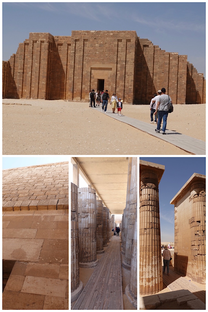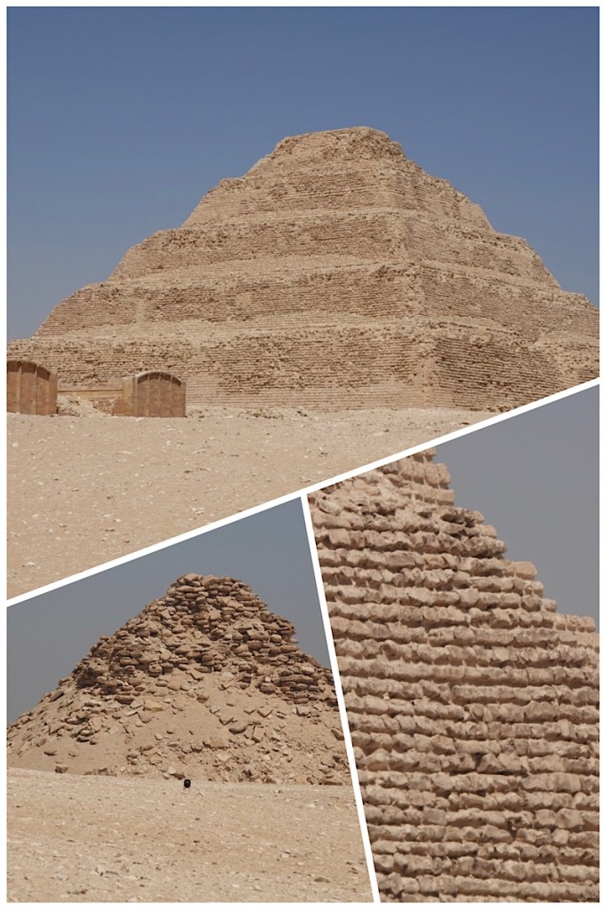 Top: Djoser’s Step Pyramid. Botton left: a secondary pyramid, much more eroded. Bottom right: close-up of the mud brick construction.