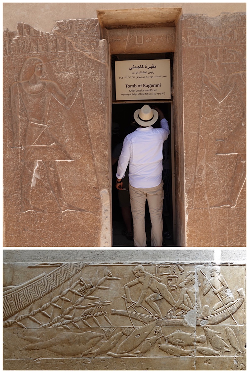 Top: our 6-foot tall assistant tour guide Muhammad in the doorway to Kagemni’s tomb. Bottom: internal high relief carving of daily life in ancient Egypt.