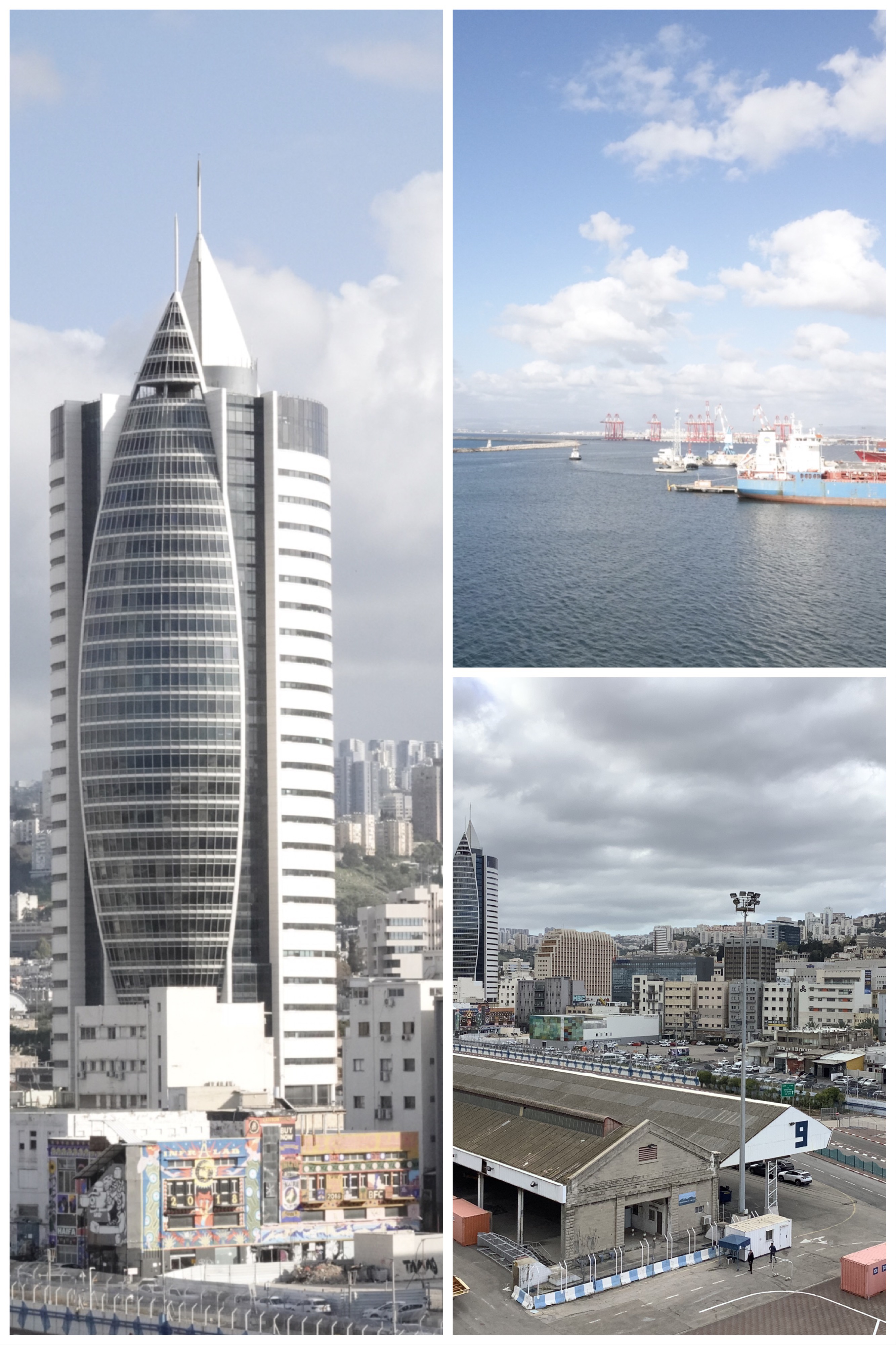Today and tomorrow we’re docked in Haifa, which is also an industrial port, but small enough that the cruise ship area has a direct view into the city, which is full of interesting architecture, particularly the gleaming glass “rocket ship” building that houses administrative offices, including that of the Mayor.