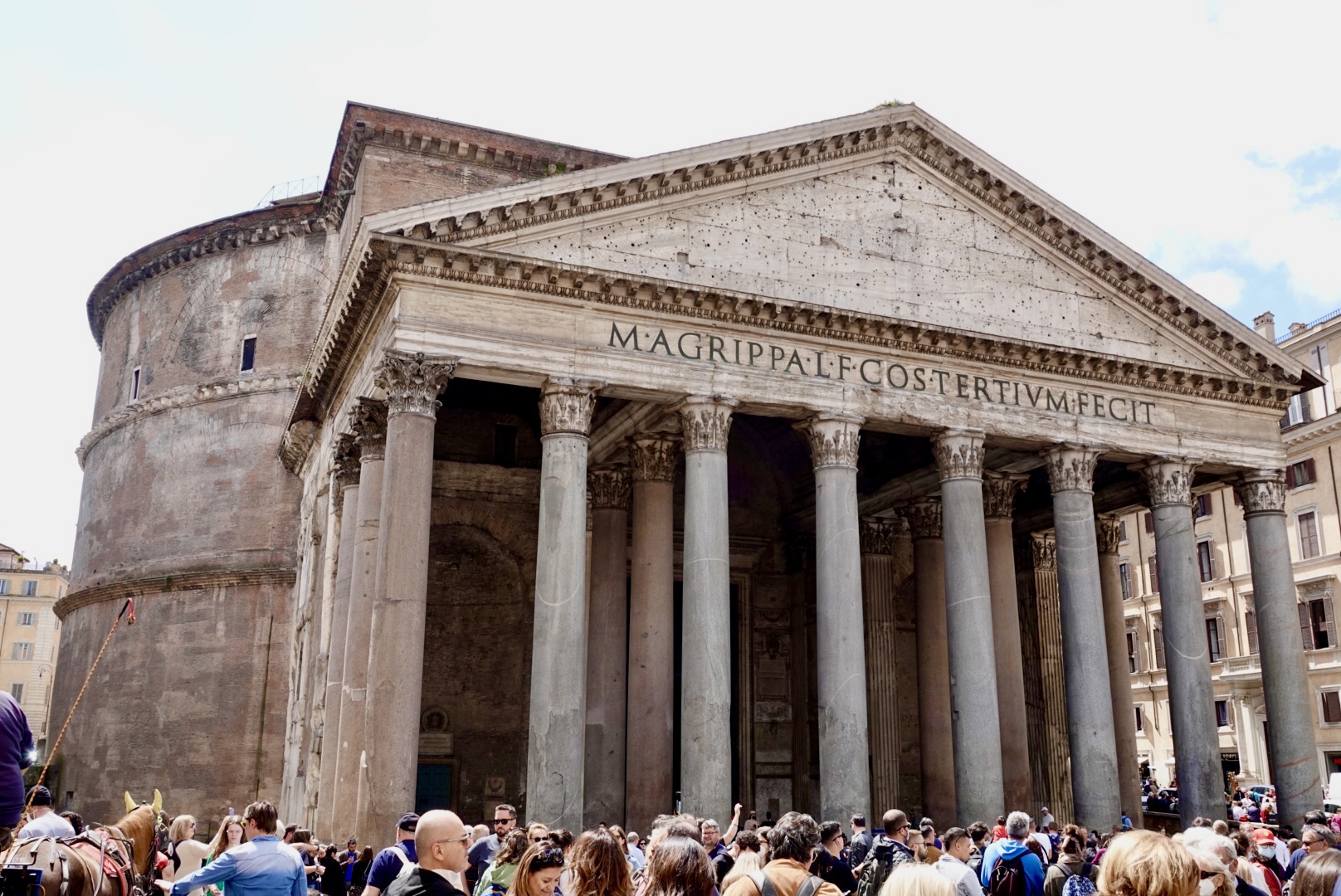 The Pantheon, with its inscription: Marcus Agrippa Son of Lucius made this in the third year of his reign. The rounded portion of the temple was originally hidden behind porticoes. If we looked closely, we could see the arch shapes on the brick where they were attached.